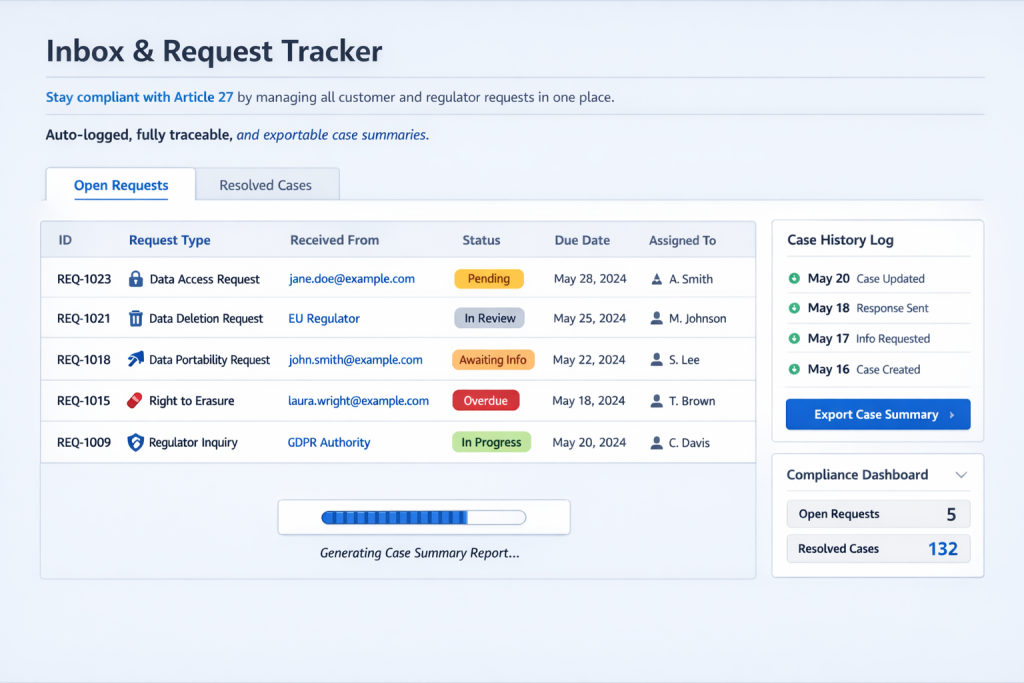 Maintain GDPR Article 27 compliance by handling data subject and supervisory authority inquiries through a single secure dashboard. Every request is automatically recorded, fully trackable, and can be exported as a comprehensive case file to meet audit requirements and response timelines.
