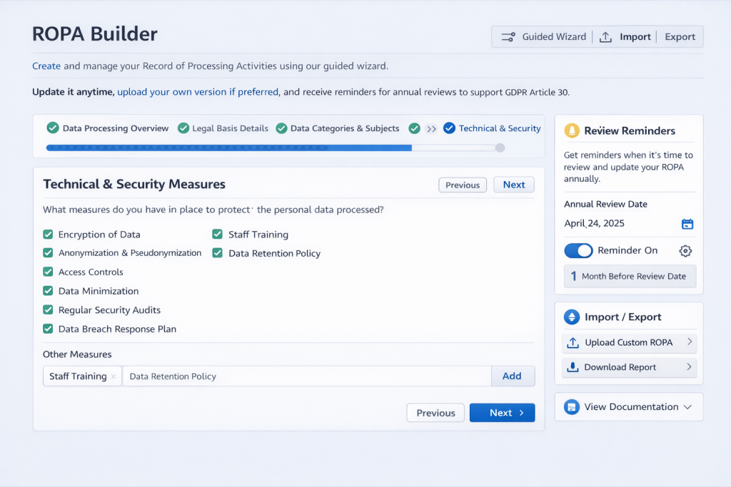 Easily build and maintain your Record of Processing Activities with our step-by-step guided setup. Edit your record at any time, upload an existing version if you prefer, and get automatic reminders for annual reviews to help ensure ongoing GDPR Article 30 compliance.