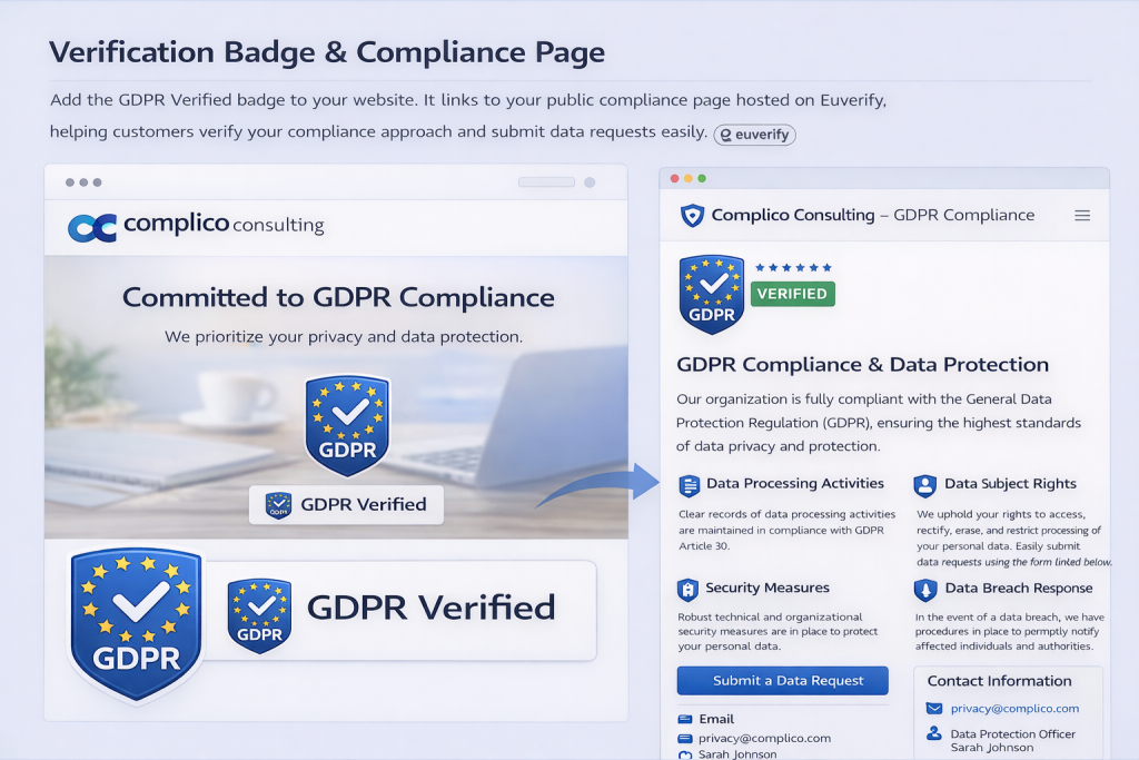 Display the GDPR Verified badge on your website to demonstrate your commitment to compliance. The badge connects directly to your public compliance page hosted on Euverify, allowing customers to review your compliance practices and conveniently submit data requests.