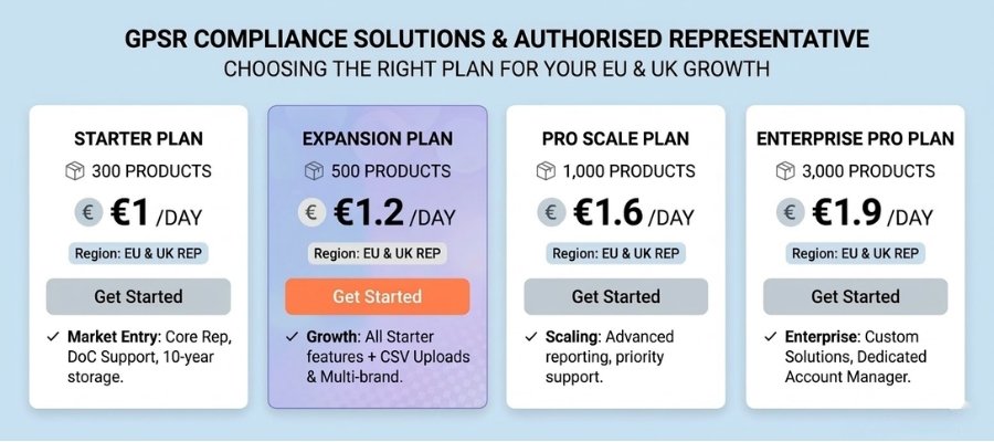 Protect your brand, build trust with your customers, and secure your market access today. Partner with a trusted GPSR EU Authorised Representative and check out the plans in detail to find the perfect fit on our pricing page.